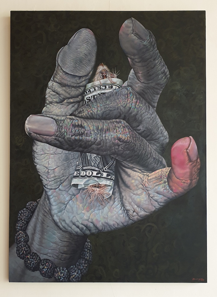 1 $ 2 Rangda, 2015, is rendered in dark and gloomy tones. Darma Yuda depicts a grey hand clutching a rolled American dollar note, from both the top and bottom of the bill protrudes the head of the wicked witch Rangda from the mythical Balinese Calonarang tale. Adorning the wrist is a prayer bead bracelet, while the hand is positioned akin to how a Balinese Hindu priest would clutch a ceremonial bell. The small finger detached is pointing up and outward; the tip is coloured red. “In taking a stand, when we are faced with many choices, sometimes when we behave in the grey,” said the artist who has been exhibiting extensively in Bali and Java since 1995. “We need to have a strong and firm attitude to achieve our goals; that’s why I rendered the little finger red.”