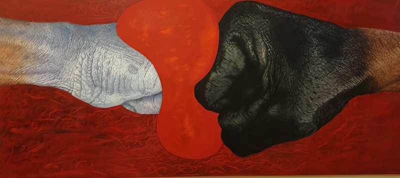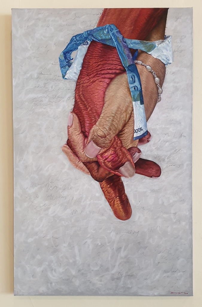 Darma Yuda’s close-up exploration of the human hand is for a sound reason. The hand holds the power to administer and execute many acts and expressions of our behaviour. Hands are depicted pulling, punching, concealing, threading, embracing, and revealing acts of both kindness and the adverse, throughout his body of work. Hyperrealism was a popular trend within Indonesian contemporary painting about a decade ago. In Bali one could think of the technical mastery of I Gusti Nengah Sura Ardana from Denpasar and his pictures of elderly folk often marginalized within Balinese society. Darma Yuda is also technically proficient, his themes, however, delve much deeper than Sura Ardana’s.