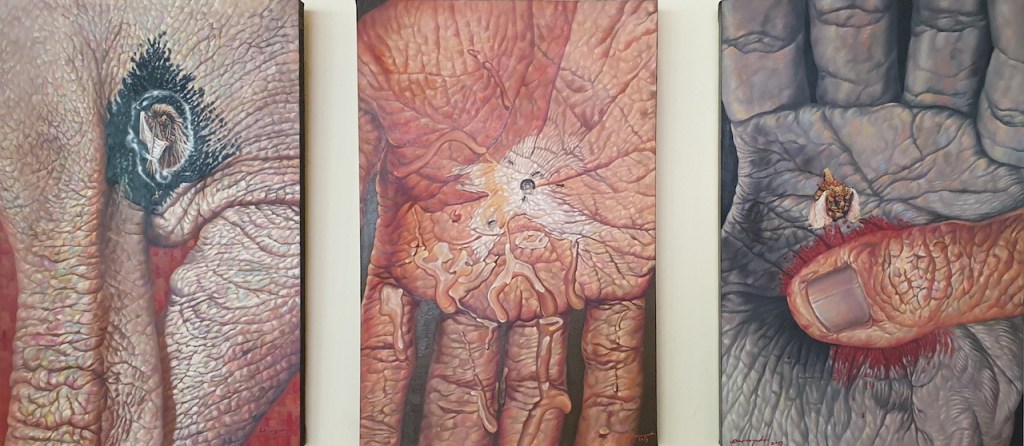 Darma Yuda’s ‘real’ world delivered confronting content, boarding on the violent. The middle panel depicts a red finger poked in an ear with a blue Indonesian 50,000 Rupiah note piercing the lobe. A hand with full spread fingers conceals an older woman’s red-brownish face on the right panel, the gap between the thumb and forefinger exposes an eye — humanity, and life force are projected out. The left panel features a hand cupping a face, palm positioned on the forehead with fingers pointing down. The lips are coloured crimson blood red. Darma Yuda’s selection of colour is a potent aesthetic tool. In Indrya, contrasting skin tones of beige, red, brown and blue create immediate visual tension while emphasizing an eerie duality. The structural features, such as bones, veins and fingernails define the human vehicle. The hyper-detailed skin textures and the wrinkled outer layer that conceal the body reveal the unsympathetic passage of time.