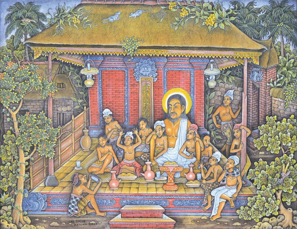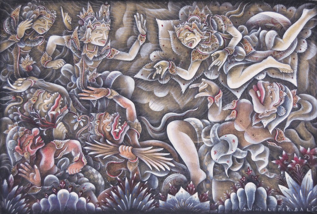 Wayan Diana (b. 1977 Batuan) comes from a distinct lineage of the renowned Batuan School of Painting, his father Wayan Tewang (1922 – 2004) was a student of the innovator/entrepreneur Nyoman Ngendon (1906 – 1946). Lot 749 Cerita Trantri, 2016 is an unusual, yet a beautiful, visually rhythmic picture of an old folk tale depicting a cow herder and his cattle and comes with an estimated price of between IDR 7 – 9 million. The Last Supper, 2019 by Diana’s older brother Ketut Sadia (b.1966 Batuan), Lot 748, is an exciting adaptation of the Christian religious narrative featuring Balinese Hindu characters and has an estimated price of between IDR 7 – 9 million.