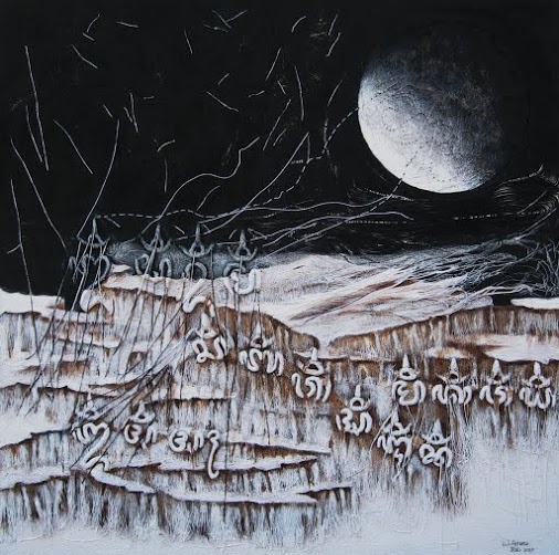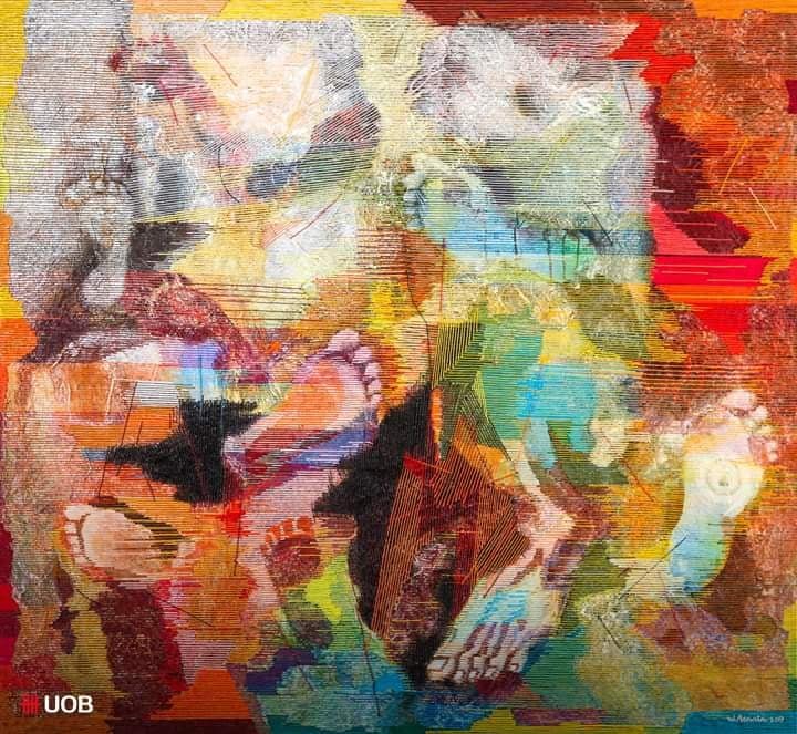 In Jakarta in October 2017 Arnata’s ‘Foot Prints’, one of more than 500 contemporary artworks submitted in the 2017 UOB Painting of the Year Indonesia competition was endorsed by the Indonesian art establishment. Arnata received one of the highest accolades in the Indonesian art world, the UOB Painting of the Year Indonesia Bronze Award. UOB Indonesia identifies artistic talents and provides them with opportunities to hone their skills and showcase their works to a wider community. Arnata’s multi-coloured picture features non-descript imagery along with human footprints and is characterized by the horizontal threads of fibre emphasising the passages of time. The varying footprint sizes define the human journey from the child to the adult.