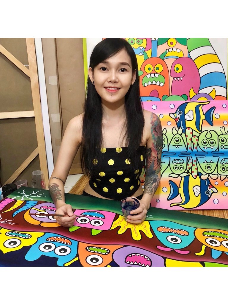 During the past five years Hana has be exhibiting extensively and contributed to various projects raising awareness to mental health issues. 2019 was a busy year, some of her shows include ‘Exaggerate Everything Exhibition’ November 2019 – February 2020 at BACKLIT Gallery, Nottingham, UK, ‘Take Over St Helens Festival’ December 2019, St Helen’s UK, and her solo exhibition ‘Suddenly Monster’ December 7, 2019 at Ganara x Artsphere, Senayan, Jakarta.