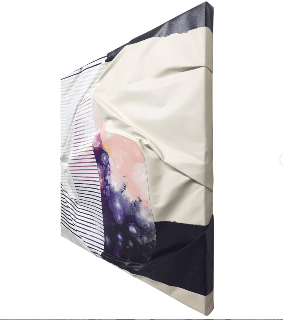 Beneath the surface is structures supporting the 3dimensional canvas forms. The appearance is contrasting; stiff folds of canvas project outwards, running the length of the work, along with natural waves, depressions and flowing mountainscapes. In earlier compositions, Sastra Wibawa experimented with multiple raised surfaces appearing akin to architectural awnings.