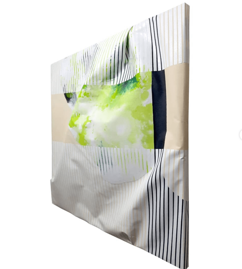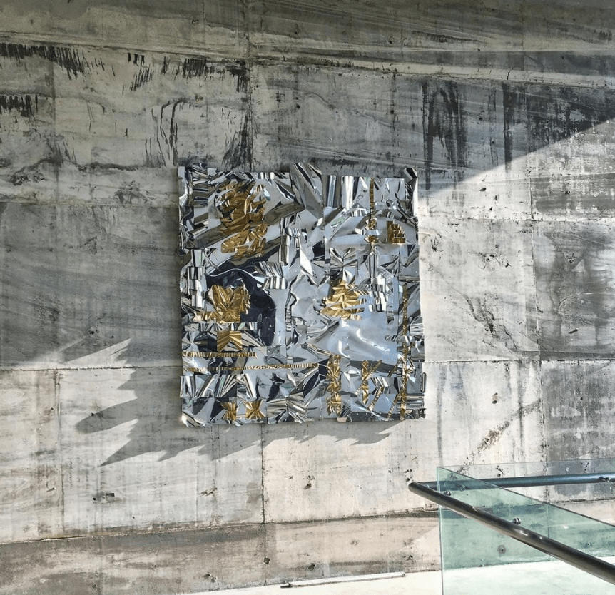 “I create small objects from leftovers from my paint palette, which are photographed, arranged and repainted onto canvas. I then cut up the canvas and cut aluminum plates according to their size. Next, I build a solid overlapping frame on a multiplex board using aluminum pipe and plate bolted together, to which I paste the canvas pieces. The overlapping and warped effects upon the surface create different shadows according to the lighting.”