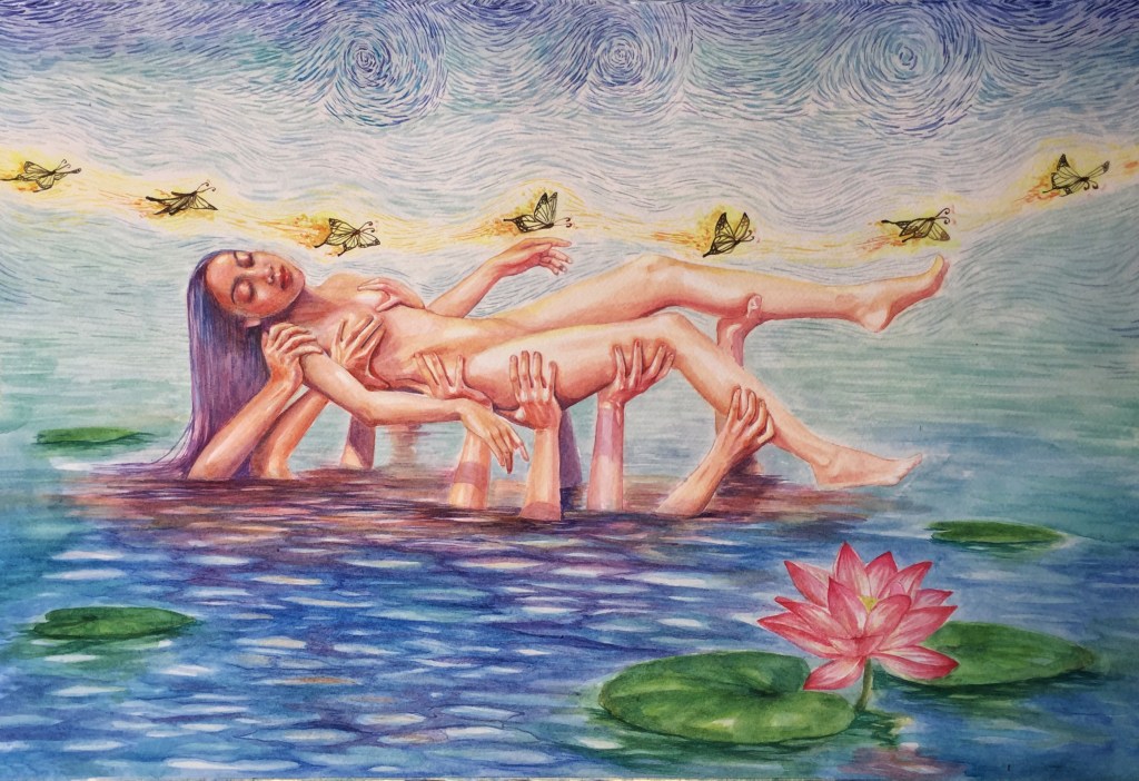 Childhood creativity developed into a passion for drawing, and by the age of fifteen, Dayu began making self-portraits. Due to her illnesses limiting her physical capacities sitting and manoeuvring a pencil was the best she could do. In 2015, Dayu was diagnosed with breast cancer. “The pain is often unbearable, sometimes making it impossible to draw. So I began experimenting with watercolour, which requires less effort. Art is my meditation and a powerful practice to help forget the pain,” Dayu said.