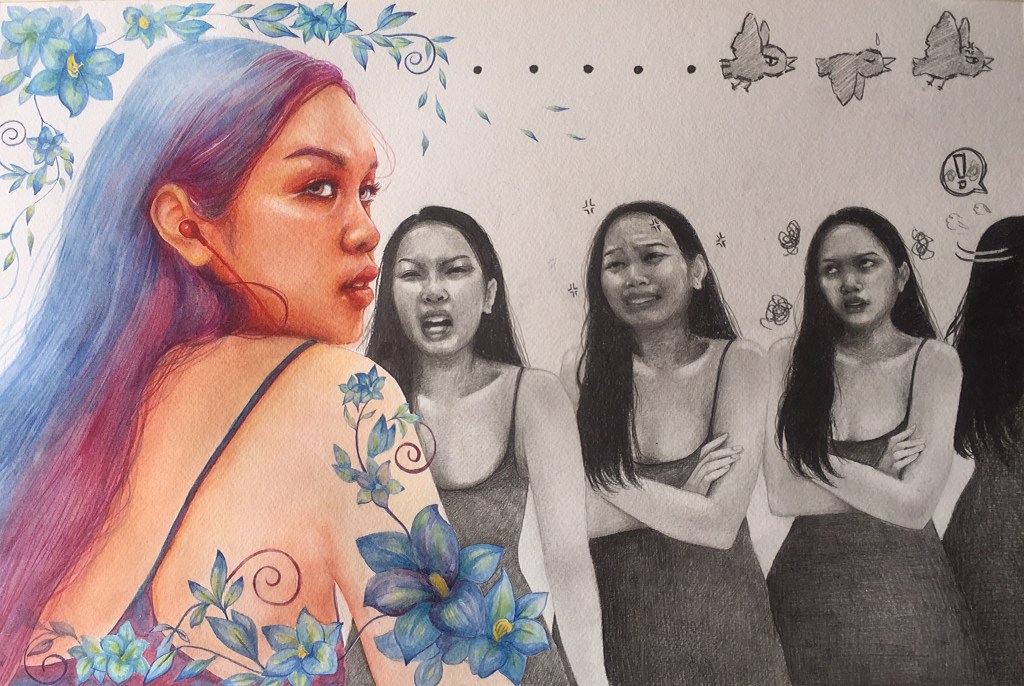 I immediately recognised Dayu as a sensitive and talented soul. Her ideas are solid and unique, backed with remarkable technical skills. Studying her Instagram content, one could quickly jump to conclusions. Is she another young lady obsessed with her self-image and social media persona? Her pictorial narrative, however, is by intent. “I’m doing self-portrait painting for therapy, trust me..it works.” states her IG profile.