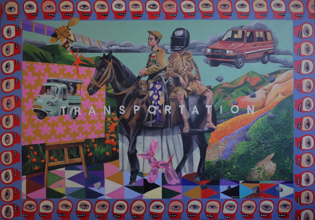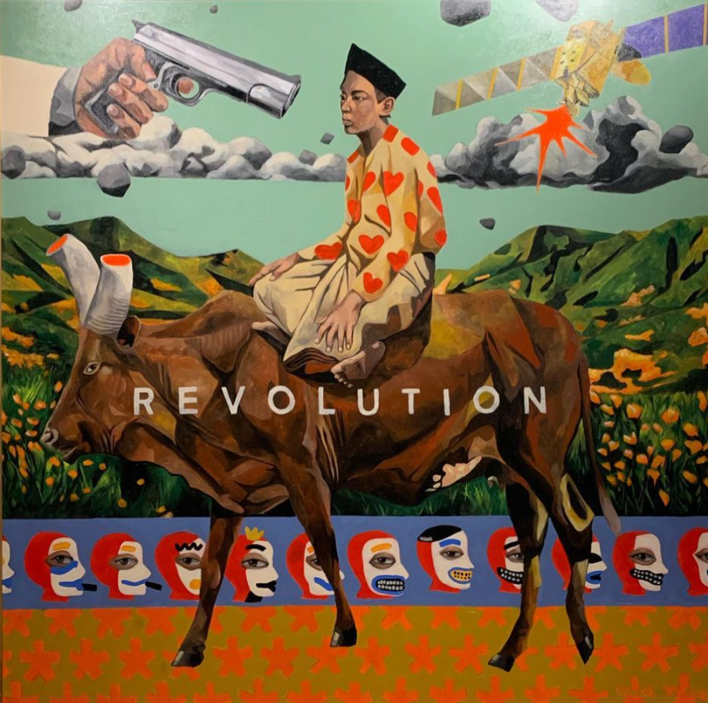 ‘Revolution’ 2021, by emerging Balinese artist Andre Yoga, depicts an Islamic man in a shirt emblazoned with red hearts casually sitting atop of a cow with a pistol drawn to his head. A shower of meteorites falls from above while a satellite beams frequencies to earth. A beautiful natural background is anchored by a band of blue with an array of one-eyed faces grinning out at the observer. Andre cleverly balances the duality – the threat of extreme violence is neutralized by a vibrant landscape and the omnipotence of love.