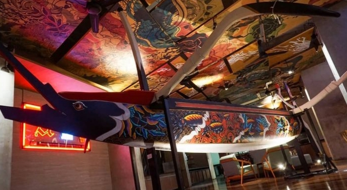 Swoofone’s upcoming exhibition ‘Prerai Anyar’ with his friend Wayan Donik Dangin at Artotel Sanur in March 2021 features three collaborative and three personal works by the artists. The painting collaborations on fishing boats feature two traditional wooden jukungs, distinguished by their symbolic bow ornament the Gajah Mina. The exhibition explores cultural ties with fishing which have followed both artist’s family lineage through the generations.