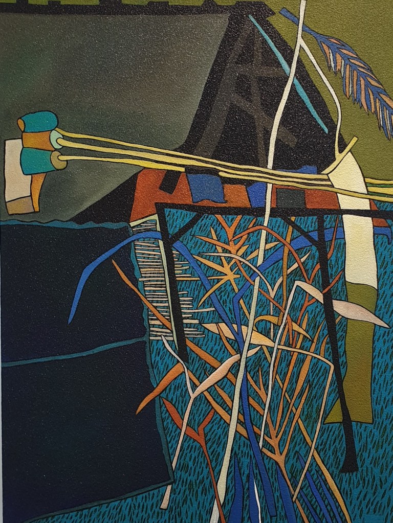 ‘Serumpun padi di sawah/Rice Field’ 2020 describes a small shelter in his family’s rice field. The building’s apex, iron roof and walls rendered in dark tones dominate the paintings composition which divided into parts. The sky is represented in a plane of olive green, while the field comes alive in brilliant blue. Mature rice plants are depicted in ochres and bronze tones. Tiny black brush strokes identify grass shoots. Metal tools and an array of timbers complete the visual information, which juxtaposes ‘still’ planes of color with the busy milieu of rigid structural lines creating a potent contrast.