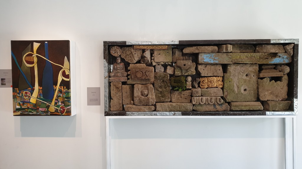 ‘Tumpukan Benda Tua/ Piles of brick-a-brack’ 2020, mixed media on canvas, 80 x 60 cm. & ‘Tumpukan Benda Tua/ Piles of brich-a-brack’ 2021 mixed media, 80 x 203 x 18 cm.