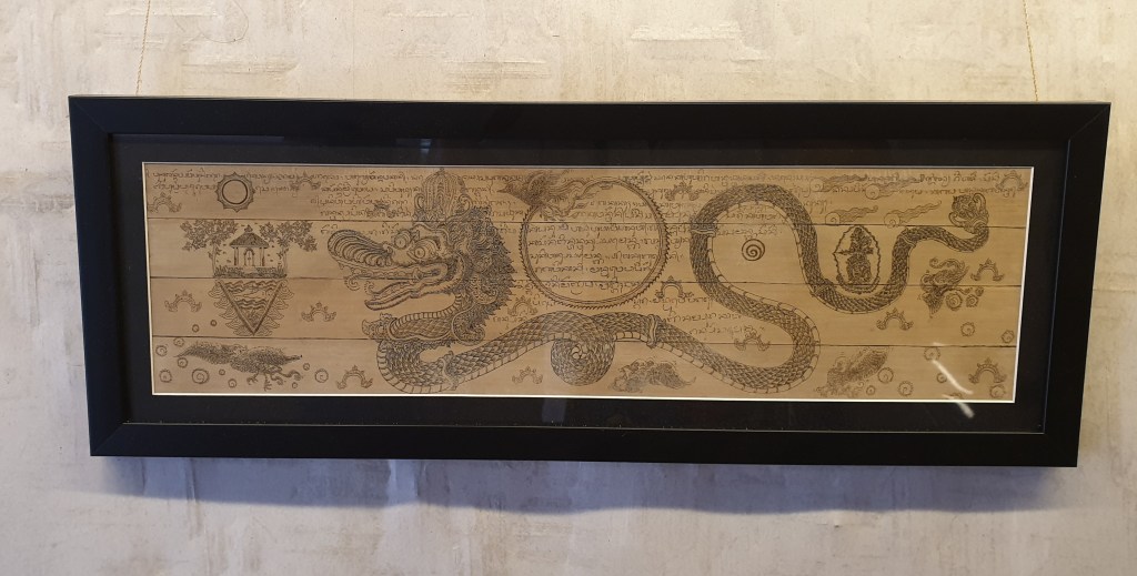 One of the many fascinating aspects of the Balinese culture is the recording of sacred knowledge onto miniature manuscripts knows as the lontar. Characters scribed with a sharp instrument into dried palm leaves are then rubbed with Hazelnut containing a black dye. The access is removed, revealing fine graphic lines upon the pale beige coloured leaf.