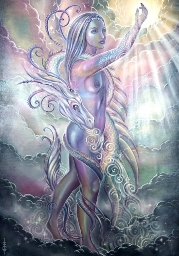‘Lemuria Rising’ Izzy’s recent painting reveals an angelic like being sitting atop of a volcano within a landscape describing her vision of the ancient civilization of Lemuria. Two dragons intertwine in dynamic swirling motion, to each side an unknown script runs vertically along the composition. At the top mysterious, loving faces appear floating above the scenario. Believed to have encompassed the Asian-Pacific region Lemuria has lasting esoteric connections with Indonesia.