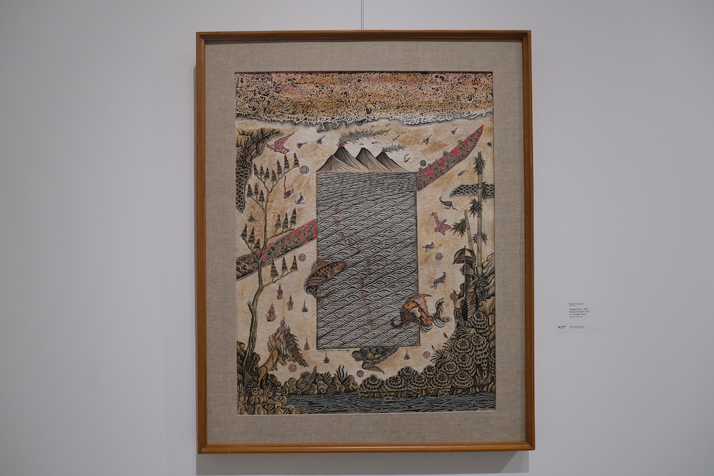 The inclusion of one of the leading contemporary pioneers of the traditional Batuan painting style Made Griyawan is significant. While the artist had to modify his method of colour application the textural qualities of the paper enhanced his style. ‘Lingga Yoni’ 2022 resonates deep visual tones reminiscent of the original 1920s Batuan paintings when the thematics emphasised duality, and the light and dark aspects of the human experience. “This experience led me to a deeper understanding of the Balinese colour philosophies,” Griyawan told the Jakarta Post.