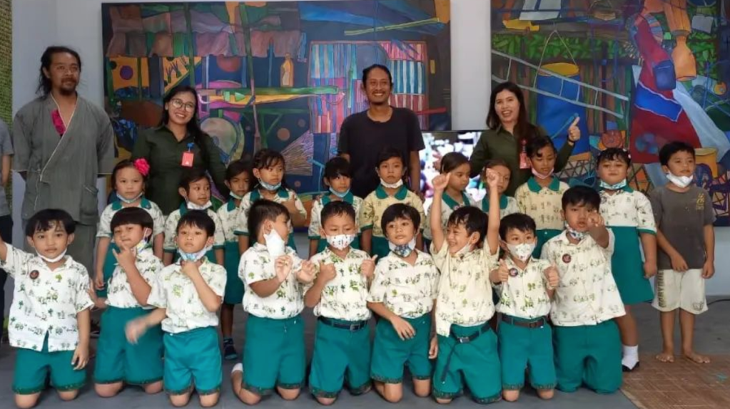 Students and teachers from Bali Hati School with KSGR members Rio Saren and Nyoman ‘Pimen’ Sukariana at Pintu Saren Art Space.