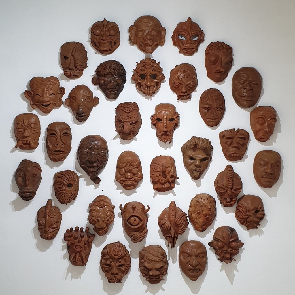 ‘Topeng Pandemi’ 2021-2022 An installation of terracota masks made by KSGR and school children on display at Pintu Saren Art Space. Image Richard Horstman