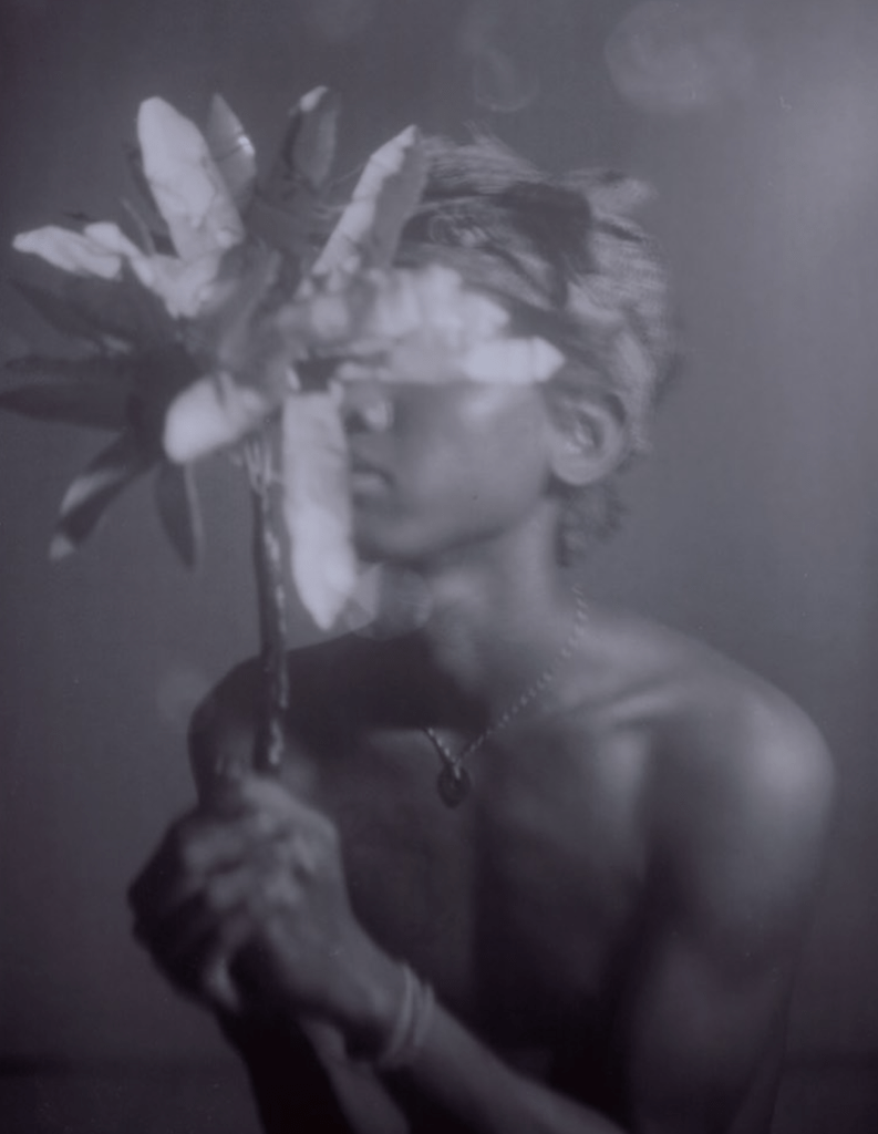‘Bunga Palsu’ (Fake Flower) is a compelling example of how Gung Ama is pushing his technical prowess towards the new creative territory. The picture describes a young man in a traditional headdress holding a plastic flower arrangement, partially obscuring his face. Artificial light sparkles upon the leaves and highlights his left shoulder, while a dark shadow defines the right. Juxtaposing dark and light with the old and new, Gung Ama creates a fascinating aesthetic collision with strong visual tension. The subject’s eyes are hidden, concealing his identity while his mouth is expressionless, adding to the intrigue. Highly suggestive, the image has a remarkable power to trigger multiple interpretations within our imagination.