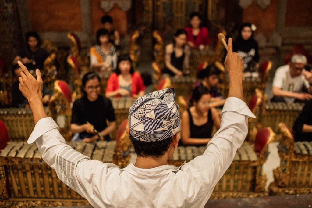 Musician and composer Putu Septa Adi leads the MFAFP participants through and exhilarating Balinese gamelan ensemble workshop