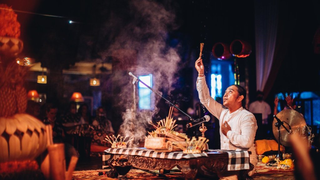 Priest Ketut Susila officiating a ceremony at Tugu Hotel, Bali. Image Dasha Almazova