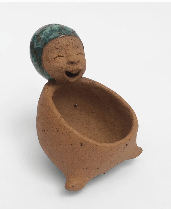 Colourful, light-hearted and cute, I was immediately captured by the art of Venty Vergianti. Her delightful pint-sized clay figurines, distinguished by jubilant emotions and childlike faces with open mouths, either smiling or bursting with laughter while sporting radiantly glazed caps, encapsulate an undeniably scrumptious art recipe. Their rotund bellies are often exaggerated, forming copious receptacles perfect for potting indoor or outdoor plants. Venty’s figures, which she labels “cadets’ are also transformed into expressive vehicles for meaningful ideas.