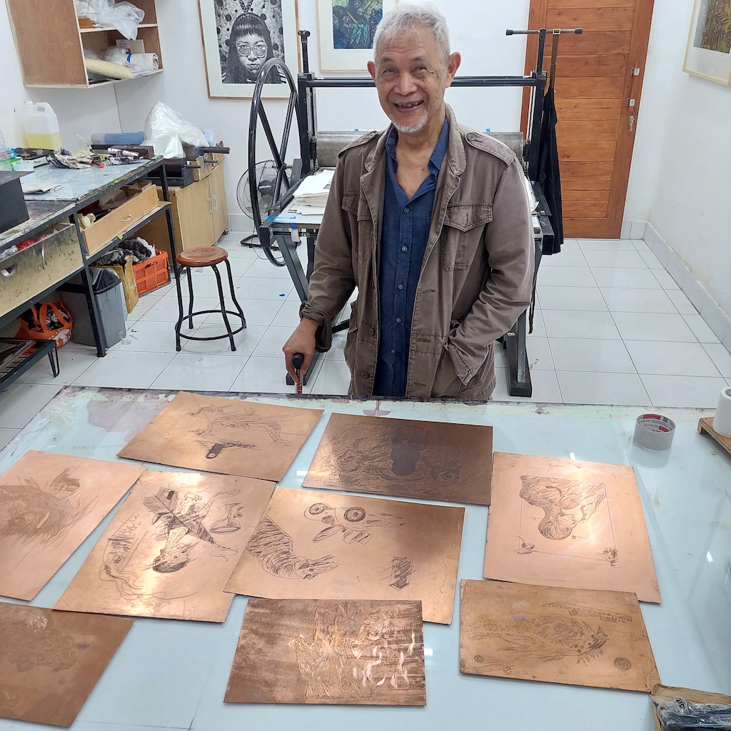 Goenawan Mohamad with copper plate etchings at DEVFTO Printmaking Institute, Sika Gallery, Ubud. Image courtesy of DEVFTO