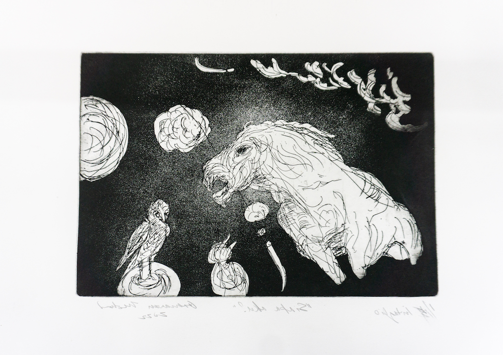“There is chemistry involved in working in the print medium. The monochromatic range within the intaglio, lithography and aquatint techniques suit me well with my tendency towards monochromes and variations of light and darkness,” Mohamad said. “Learning the process of scribing a metal plate with a knife to make the foundation of printed images, however, is challenging. The control over the knife is never consistent, it may slip, and the unexpected results make the process thrilling. You must be prepared for surprises – I like surprises.”