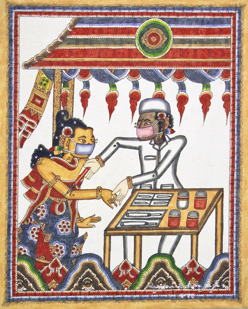 “I painted this composition because I was inspired by seeing people who died from Covid, whose bodies could not be seen, let alone touched and hugged as a sign of farewell,” Mangku Muriati told NOW!Bali Magazine. “I experienced fear, anxiety and tension during the pandemic. Along with curiosity, I also wondered whether this pandemic really exists and, if so, when will it end. By describing my observations, all feelings of fear, confusion and sadness suddenly disappeared, and I could work as usual,” she said. “My philosophical view of the pandemic is that we have received a warning from God Almighty so that we can be introspective and not forget God’s power.”