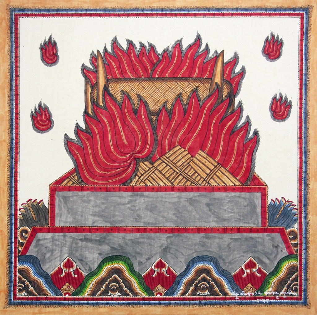 Kamasan paintings translate esoteric information into a language that may deciphered into functional knowledge to help navigate the challenges of daily life. The paintings are symbolic codified systems, all measurements and proportions unified with natural divine ratios. The artist functions as a medium by describing the multitude of narratives from sacred Hindu and Buddhist texts, along with local mythology and folk tales. The paintings also depict birth and astrological charts.