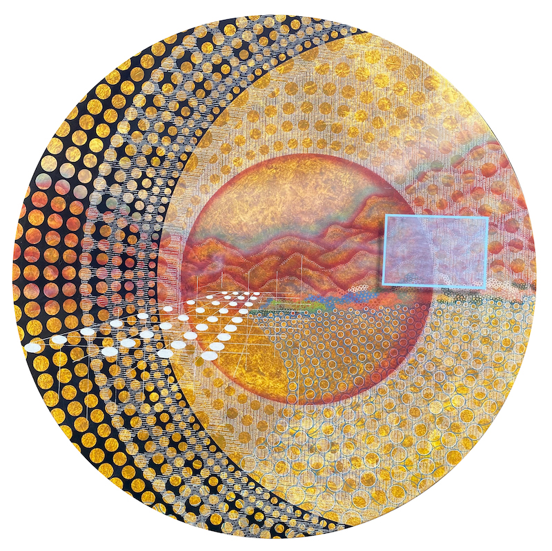 Spirals of vibrant circular geometric designs pulsate from central points. Layers of contrasting structured, repetitious patterns fills the canvas with stunning visual information. While we gaze upon the seemingly unknown vistas of movement with dazzling colour alongside earthy tones, cosmic landscapes and natural elements such as flowers and leaves remind us of home. We engage in a resounding sense of peace and calm.